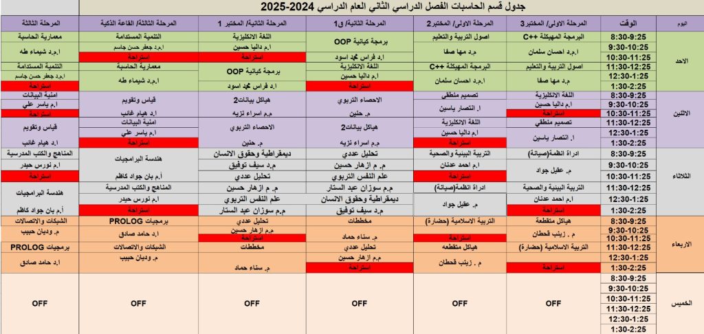 جدول المحاضرات الاسبوعي للفصل الدراسي الثاني للعام الدراسي 2024-2025 لقسم الحاسبات