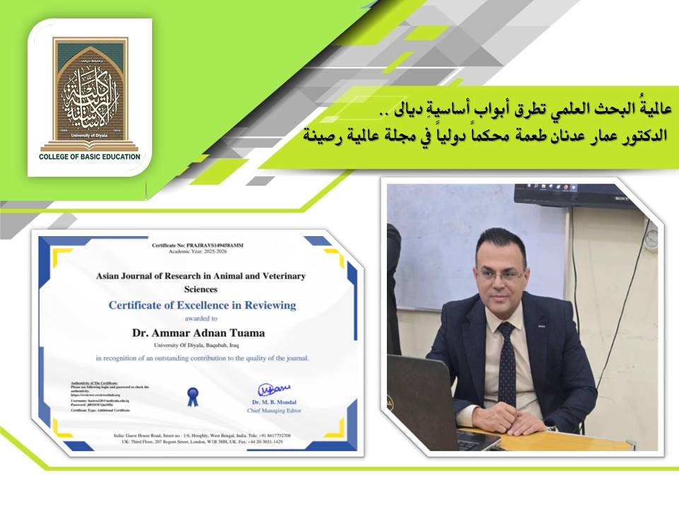 في إنجازٍ أكاديميٍ جديدٍ يبرهنُ على رصانة الكفاءات العلمية العراقية وقدرتها على خوض غمار التنافس الدولي، تم اختيار التدريسي في قسم العلوم بكلية التربية الأساسية بجامعة ديالى، المدرس الدكتور عمار عدنان طعمة، مقيماً علمياً (Reviewer) للبحوث في المجلة العالمية المرموقة: