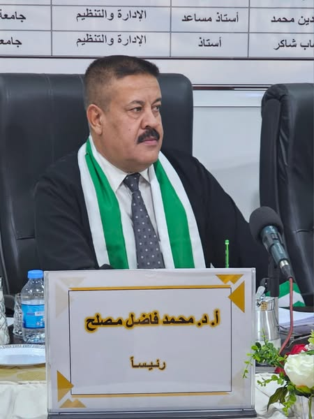 Dr. Muhammad Fadel Musleh, as chair of the discussion committee, presented a series of thoughtful scientific observations that enriched the discussion and contributed to strengthening the academic aspect of the thesis, reflecting the distinguished scientific level of the faculty of the College of Basic Education at the University of Diyala and their active role in supporting the academic movement in Iraqi universities.