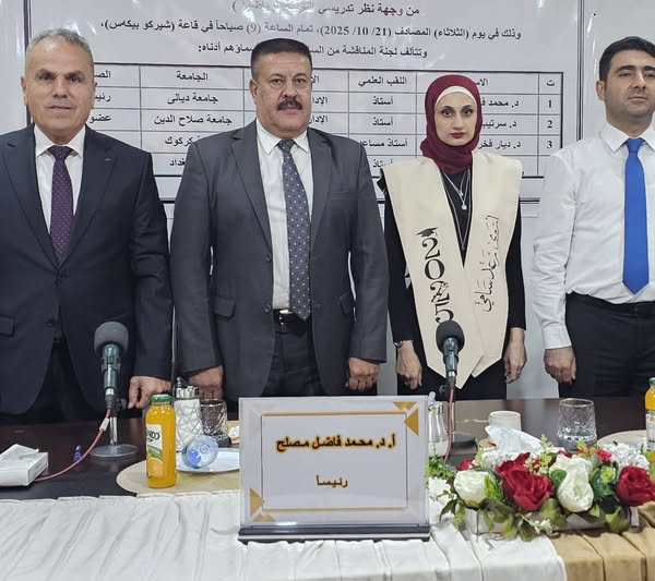 The discussion took place on Tuesday, 21/10/2025, in the Shirkobikhas Hall, on her thesis entitled “A Forward-Looking Vision for Addressing the Challenges of Implementing Gymnastics in Khanqin Schools from the Perspective of Physical Education Teachers.” The thesis addressed an important scientific topic in the field of physical education and sports science and contributed to enriching the research aspect by raising contemporary issues and offering precise methodological approaches.